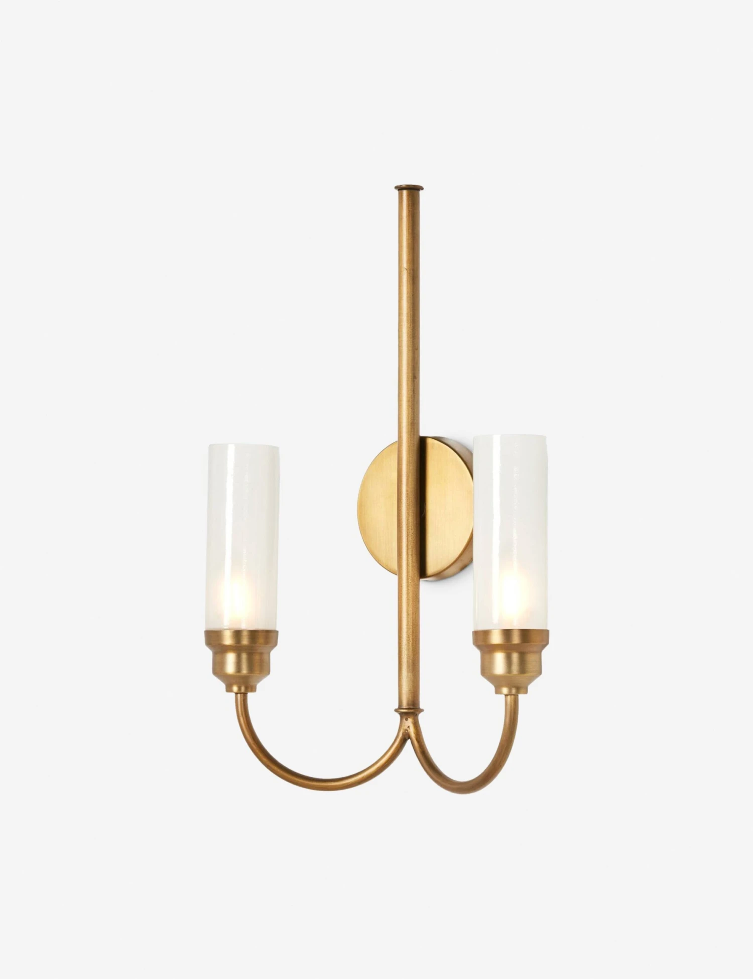 Borrowing from traditional design to create a modern statement, this sconce is a brilliant addition to your lighting design. Its dramatic, J-shaped framework pairs with a round wall plate and brass finish while light pours through a pair of frosted glass shades to bring warmth and ambiance to your entryway or living space—a standout sconce light set for elegance.