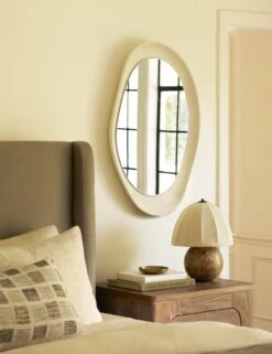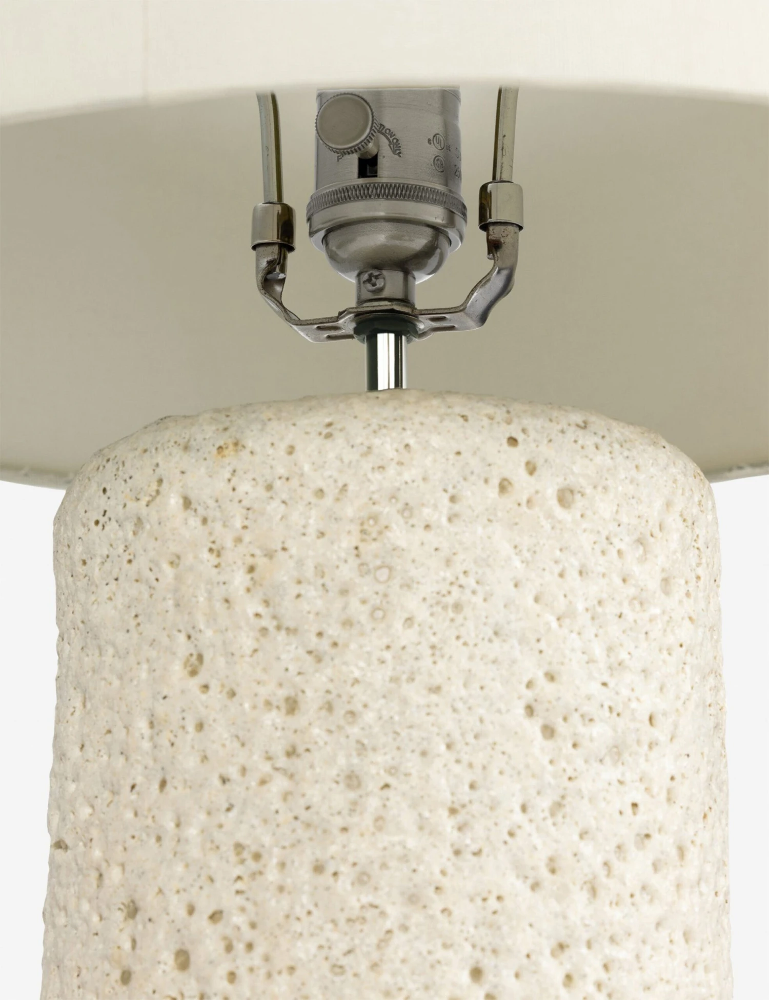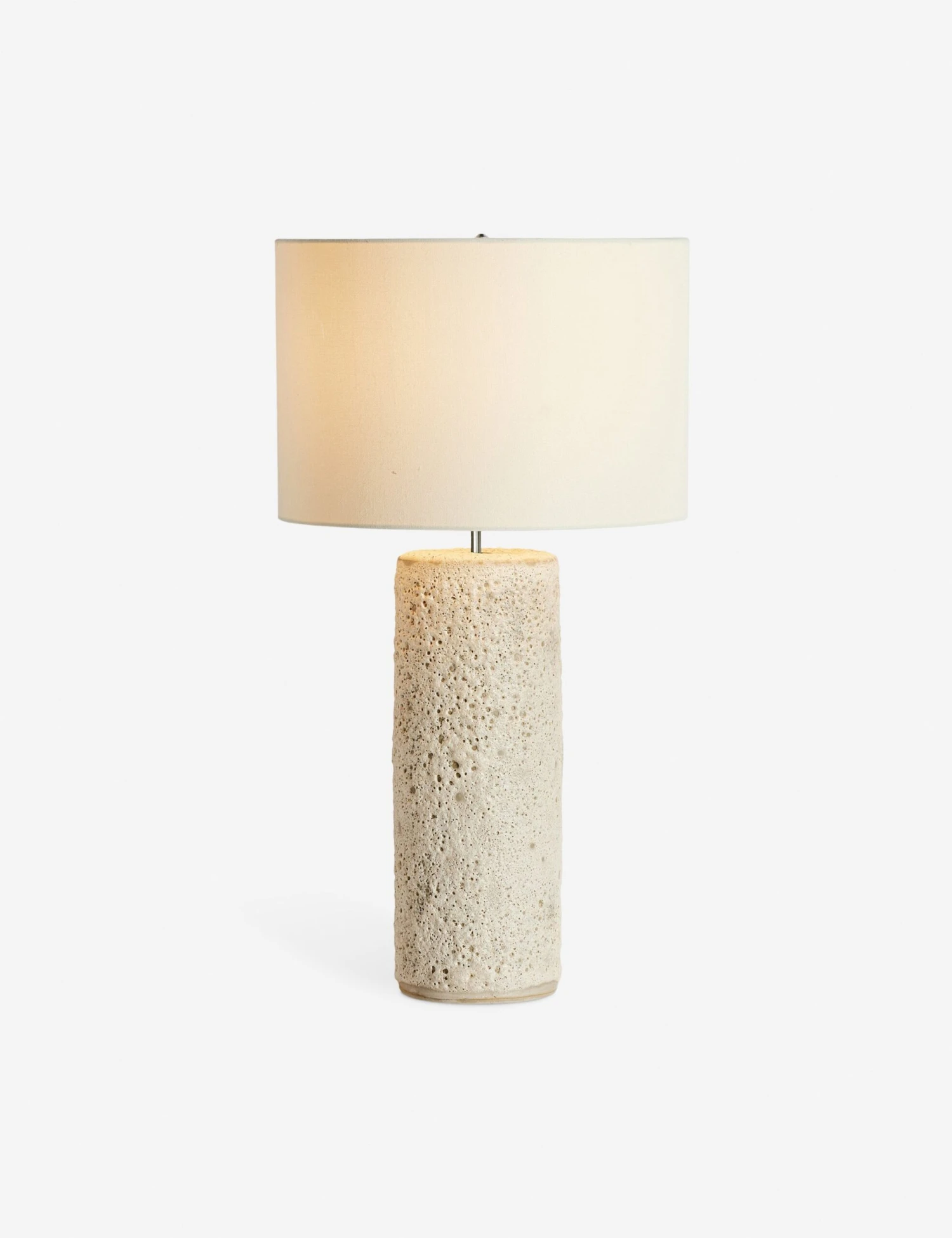 Porous texturing creates the look of natural stone in this modern table lamp. With its grounded palette, the lamp features a reactive white glaze over its statuesque base, topped with an ivory linen drum for a balanced pool of light in your living room, home office, or bedroom. A versatile look with transitional appeal, this living room lamp is the perfect addition to a casually refined edit.