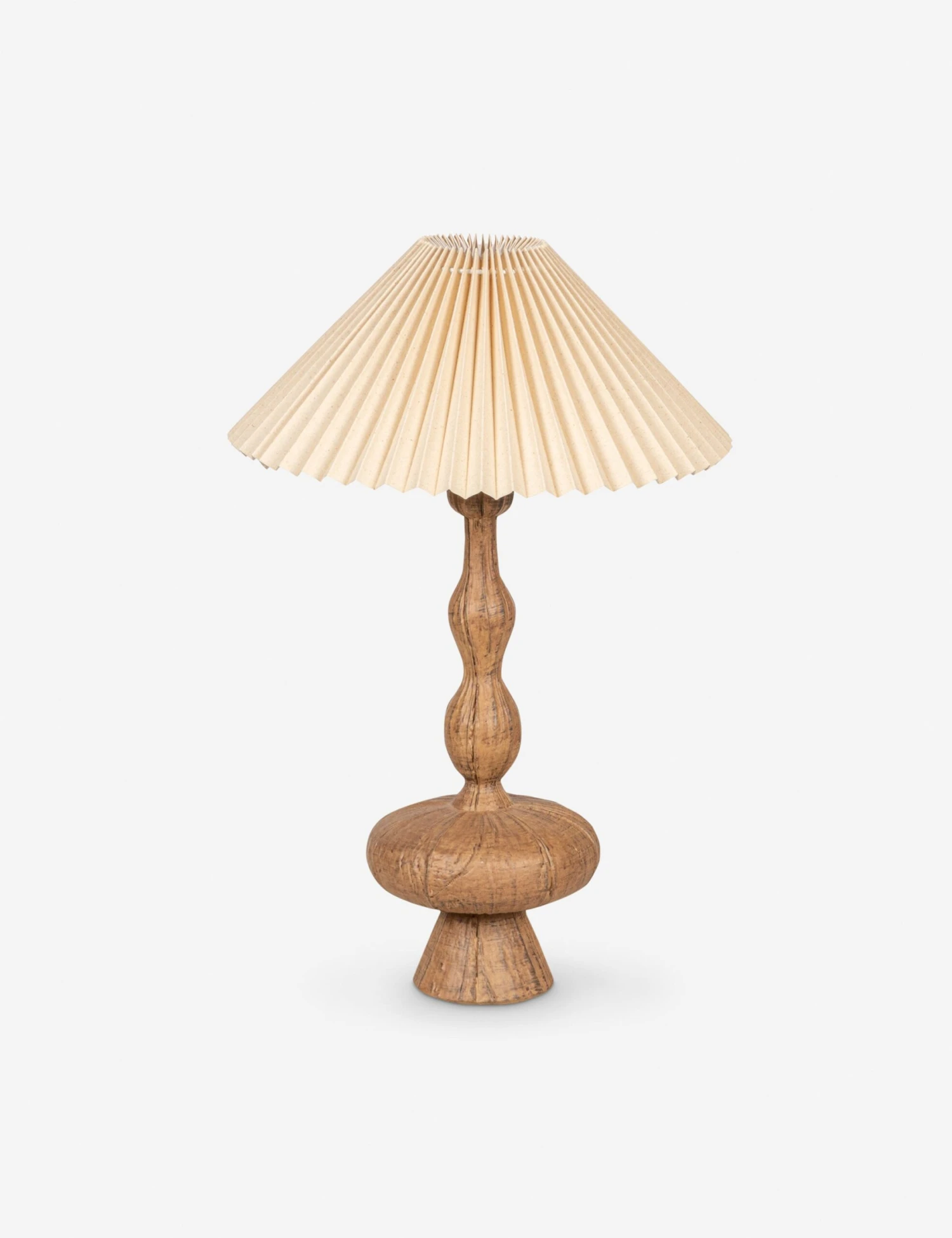 Shaped in resin with a wood-look finish, this lamp offers sculptural presence with organic warmth. The pleated shade softens the light, making this table lamp a versatile choice for consoles, nightstands, or side tables.