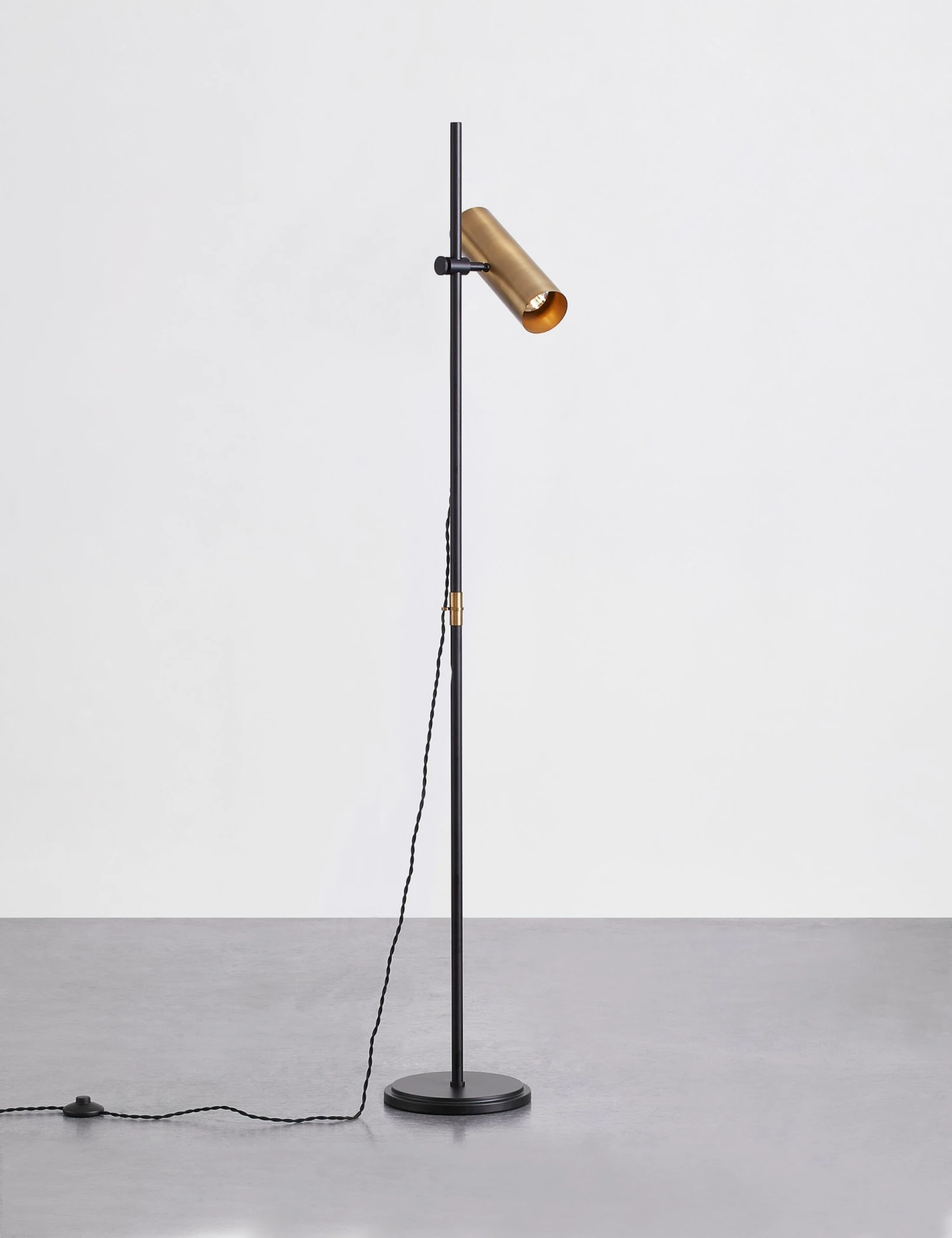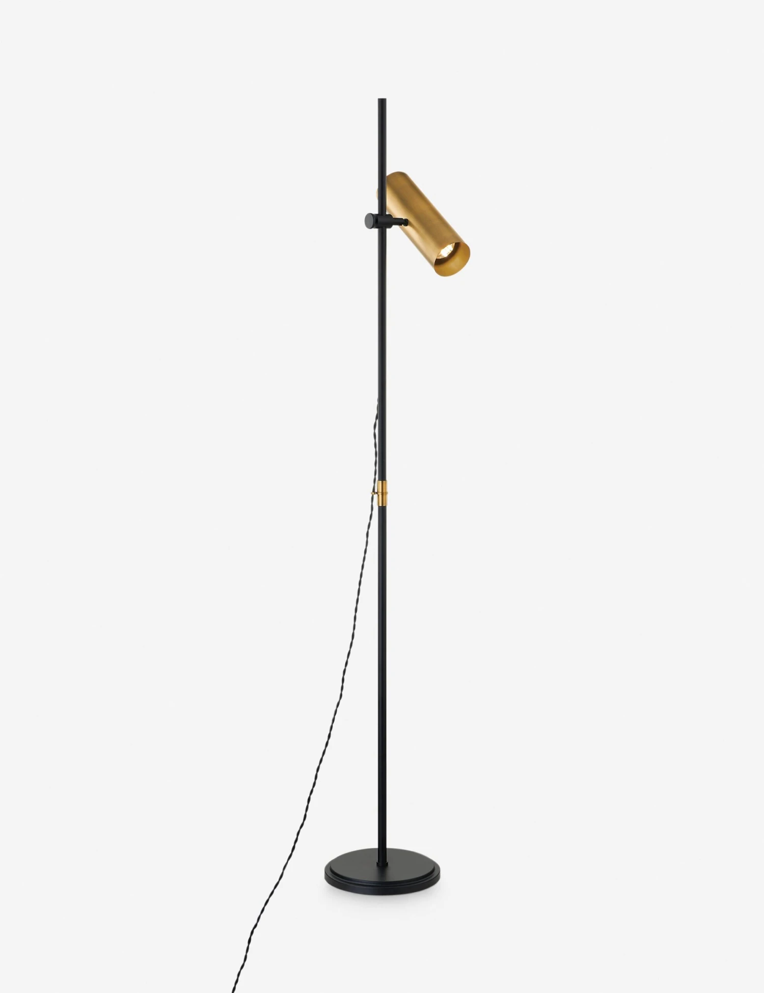 Colin King has emerged as a definitive voice in modern American design with a signature aesthetic that stems from a focus on visual storytelling. Mid-century design gets an industrial update in this chic lamp. The slim black frame holds an adjustable cylinder light with an antique brass finish for versatility and added warmth. A braided cord and brass-finished accent hook complete the look to offer a dynamic floor lamp ready perfect for task light.