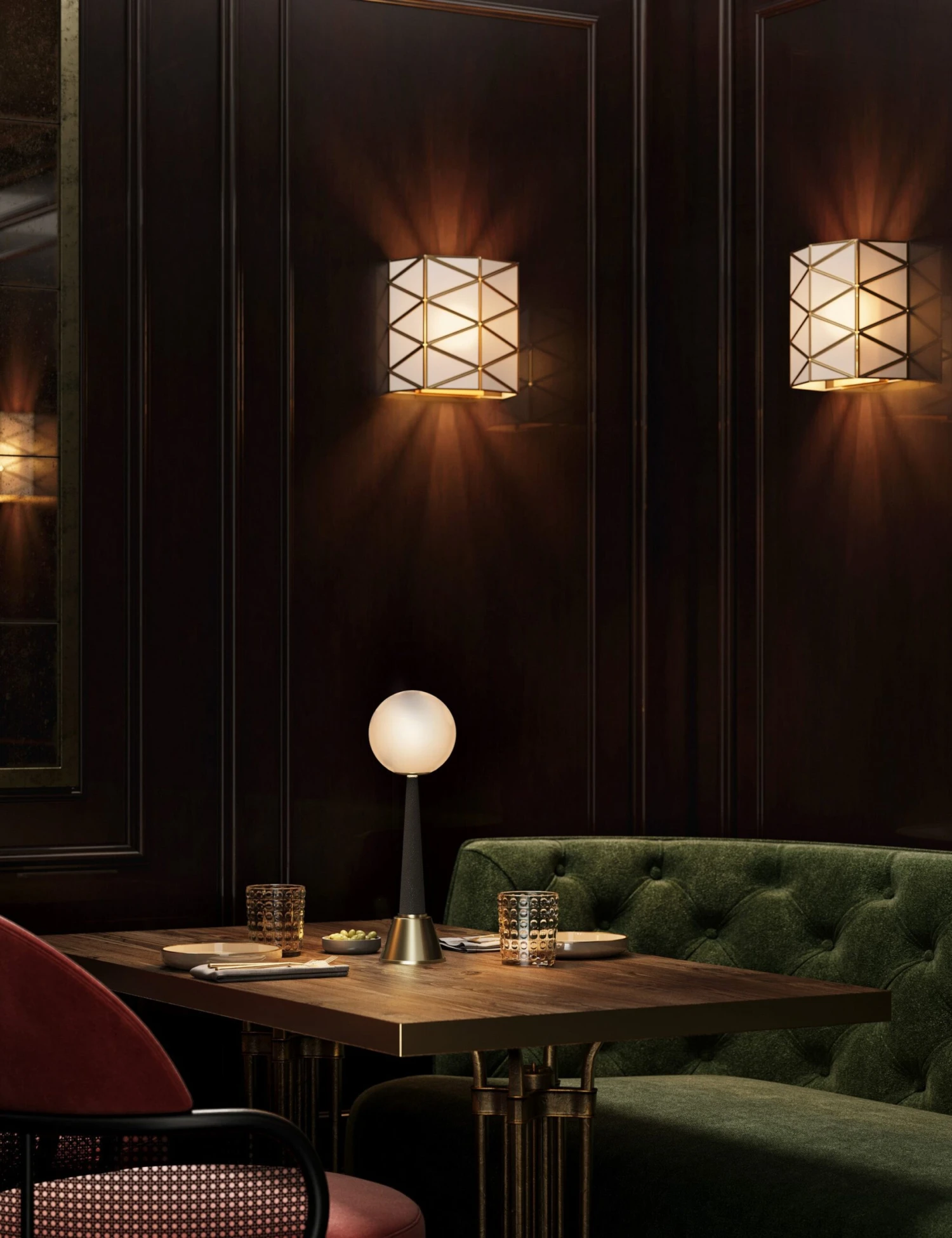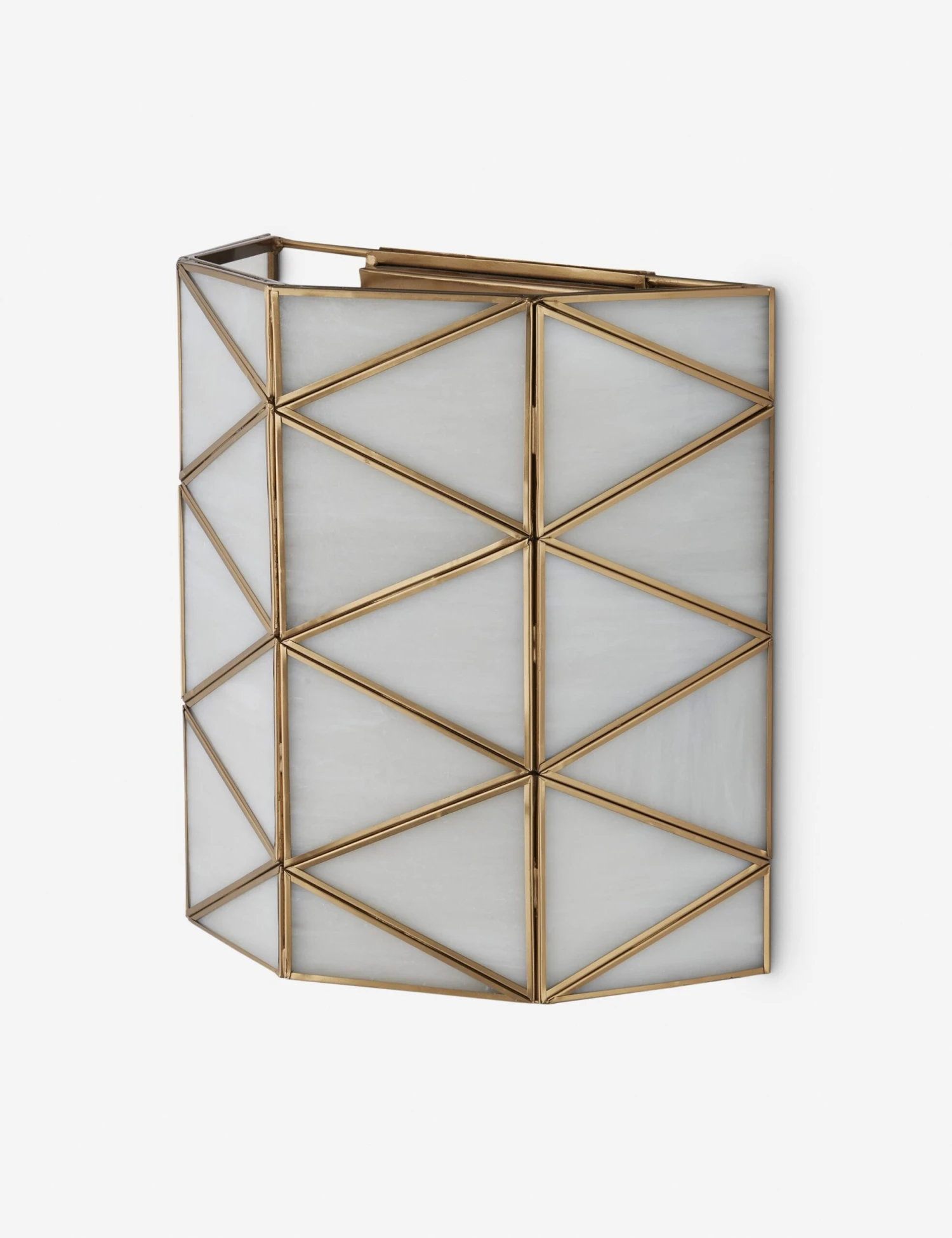 The Renelle sconce features a striking demilune profile crafted with triangular panes of white glass in an antique brass frame. The result is a refined sconce light that blends modern design with timeless textures. We love this piece styled in pairs to frame a doorway, mirror, or large-scale artwork.