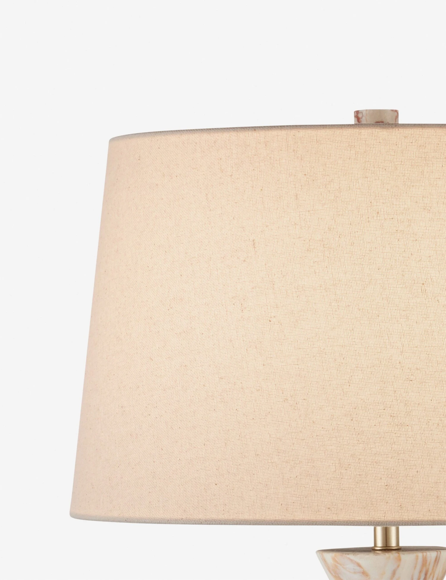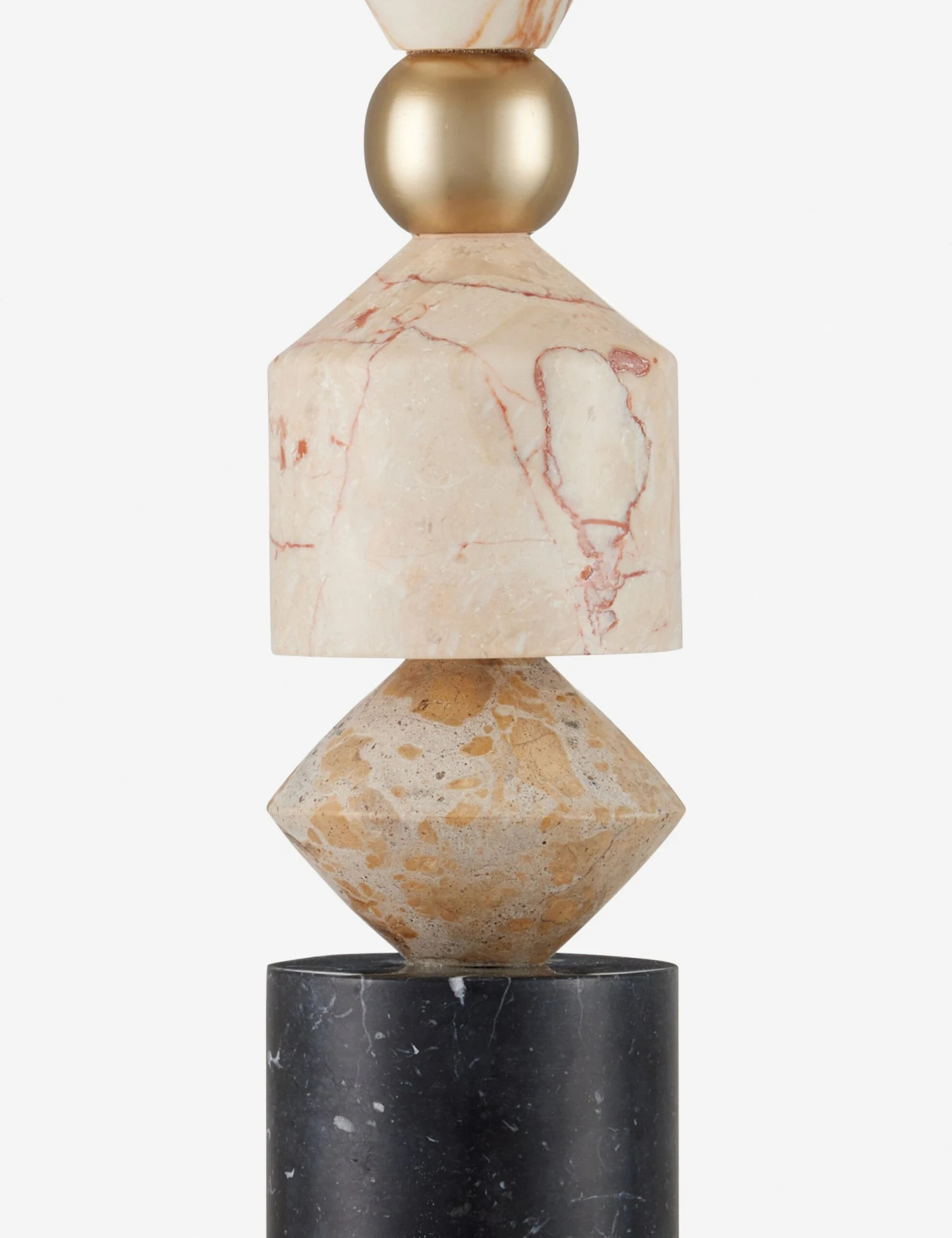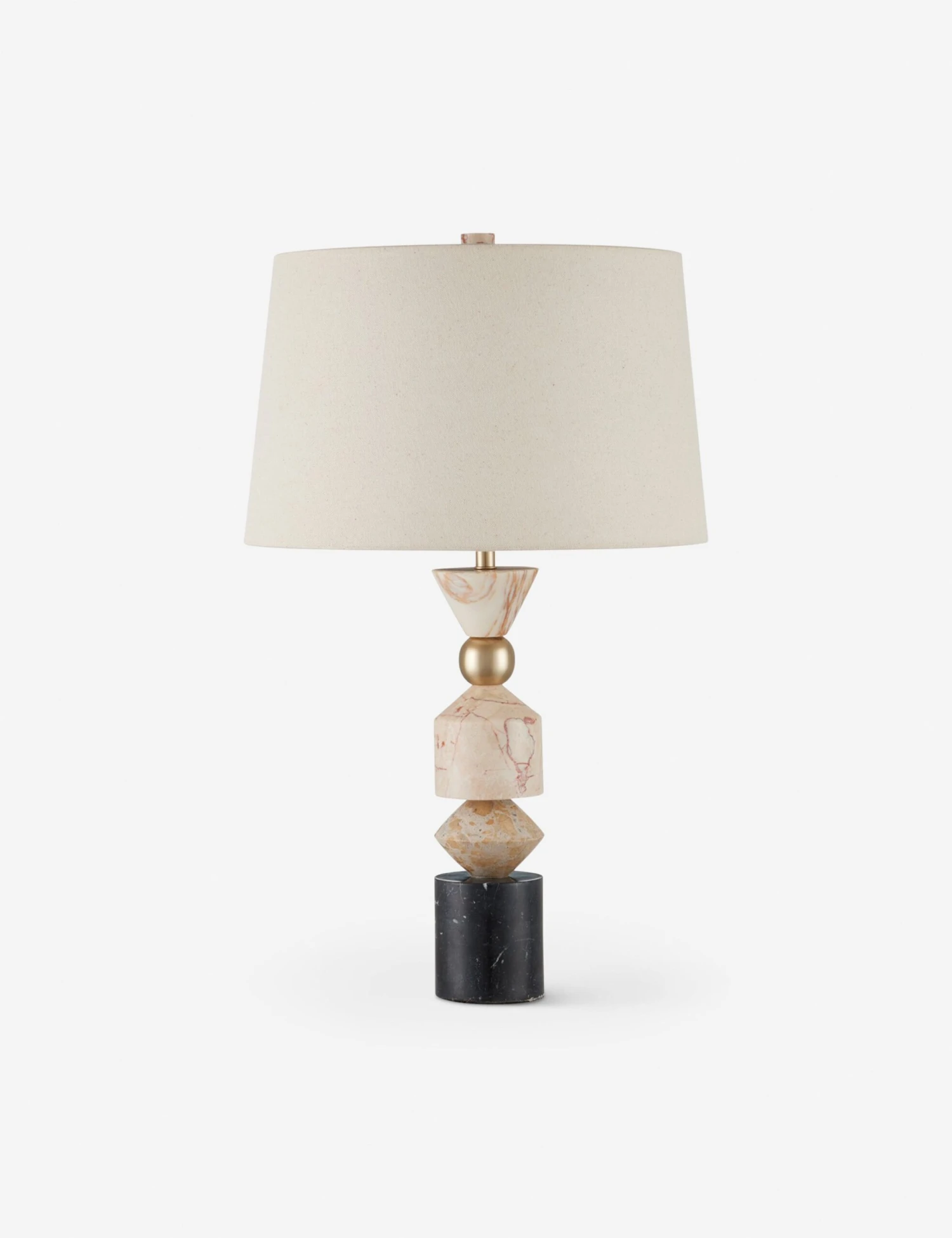 The Socorro table lamp pairs natural stone with metallic details for standout appeal. Its totemic form features marble layered in varied tones and shapes, finished with a soft linen shade. Style this geometric lamp on a console, desk, or sideboard to show off its bold material mix.