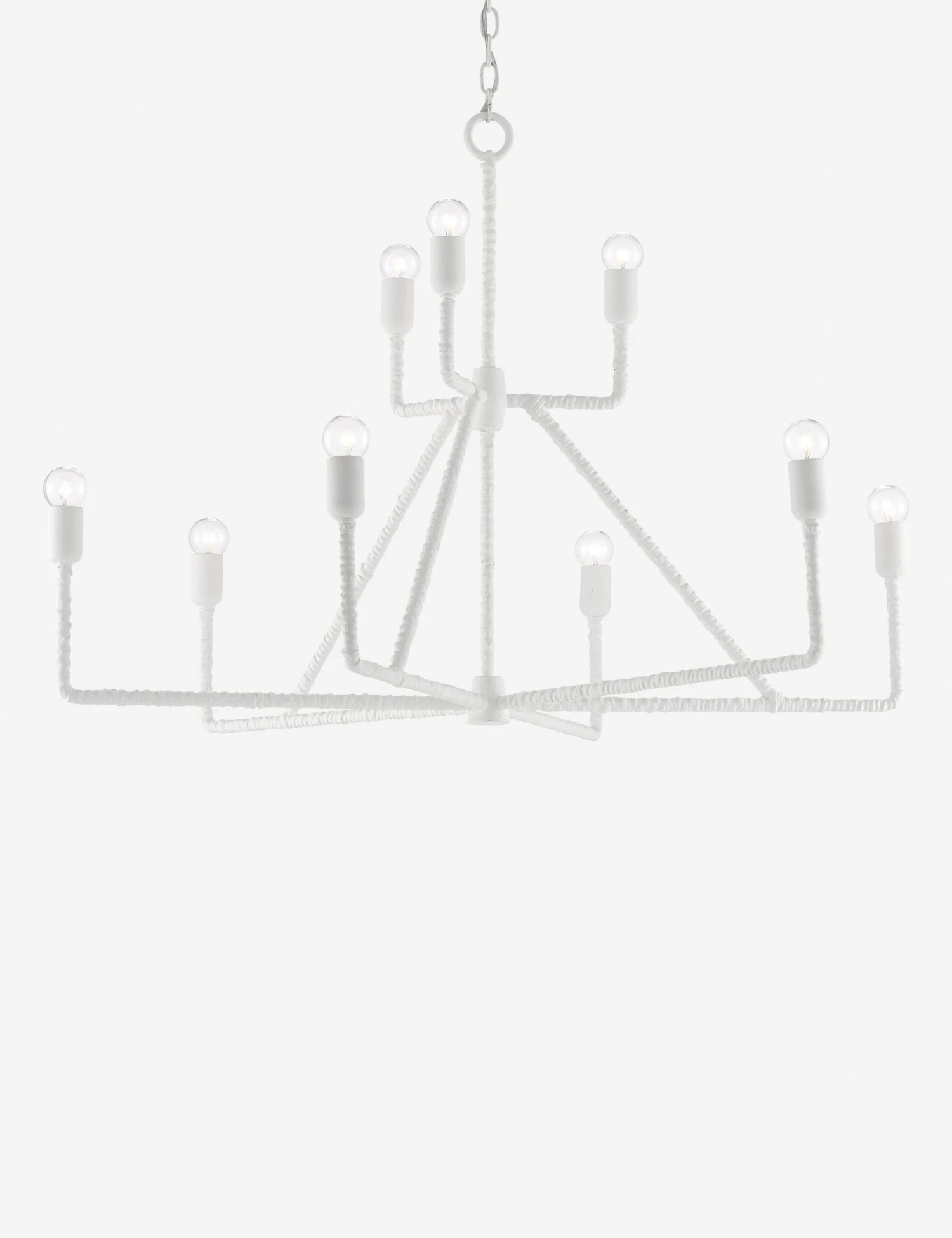 Style a statement in white with this eye-catching chandelier. The angular iron frame is wrapped in rattan, then finished with gesso and suspended from a matching chain for a monochromatic look coursing with texture. We love how traditional elements blend with modern touches in this beautifully balanced chandelier design.