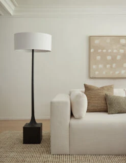 Sleek lines and a textural black aluminum base create an industrial statement piece in the Zakai floor lamp. The off-white drum shade casts a beautifully diffused light to soften and complement this modern lamp design.