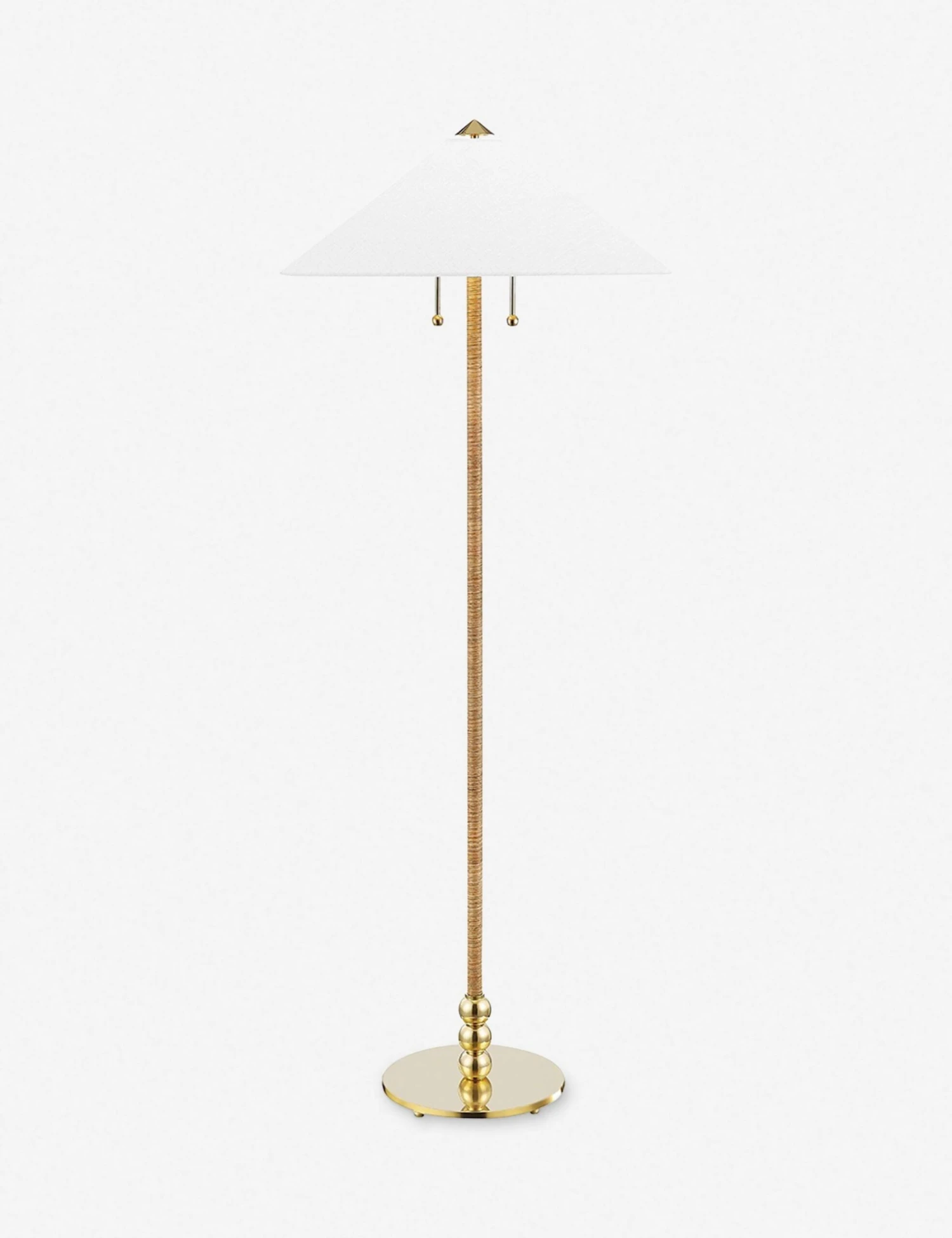 Contemporary shapes are everything with this floor lamp, featuring a textured stem with a polished base and brass knob detailing. Topped with a white Belgian linen shade, it’s a sleek and stunning addition to living rooms, home offices and sitting areas.