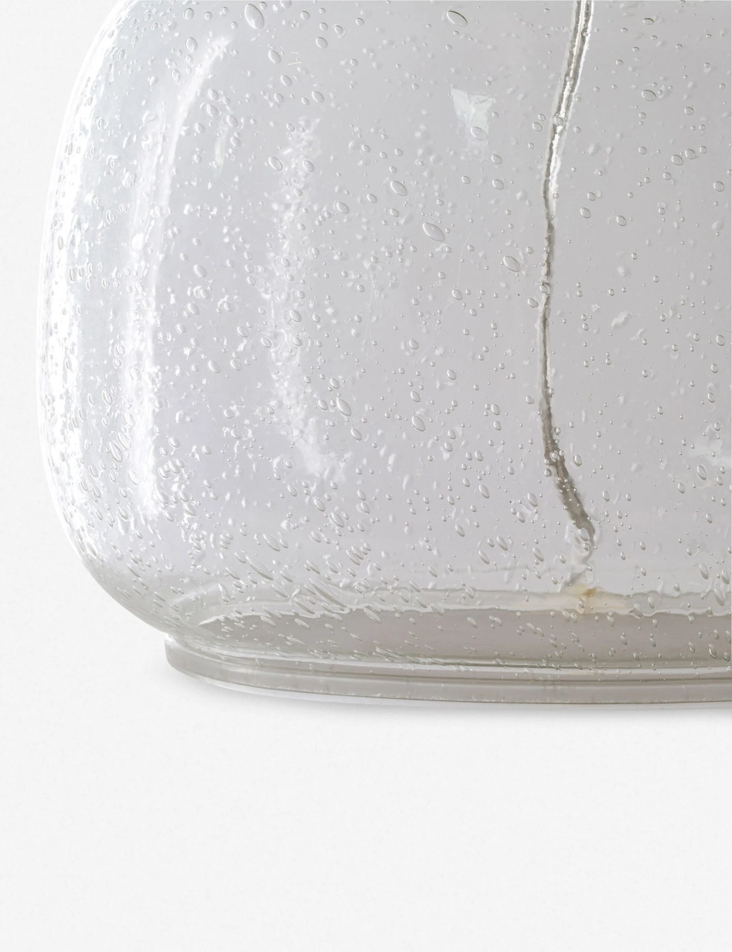 This chic table lamp features a transparent glass base with bubbles for a transitional look. The beige drum shade keeps the look neutral enough for any living room or bedroom.